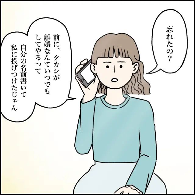 すると、「忘れたの?前にタカシが離婚なんていつでもしてやるって、自分の名前書いて私に投げつけたじゃん」とどこまでも冷静なスズカさんが淡々と話すと、
