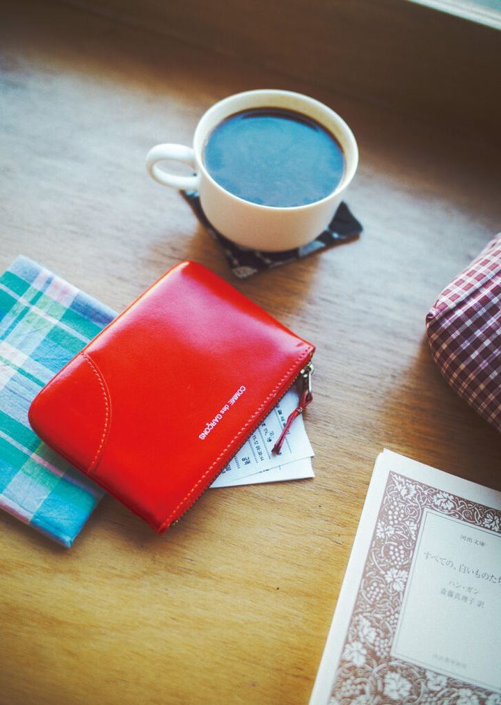 旅に出かけるときはできるだけ身軽でいたいから、選んだのは〈ウォレット・コム デ ギャルソン〉のジップポーチ。片手に収まるコンパクトなサイズと、かさばりにくいスリムなシルエットで持ち運びがしやすく、数日の旅行の財布として使うなら収納力も十分。ロゴが箔押しされた滑らかでツヤのあるレザーを使用しているので使い込むほどに味わいを増し、経年変化も楽しめる。これからもさまざまな場所へ一緒に出かけたくなる。ジップポーチ[W14.5×H10㎝]¥14,850(コム デ ギャルソン 03−3486−7611) その他スタイリスト私物