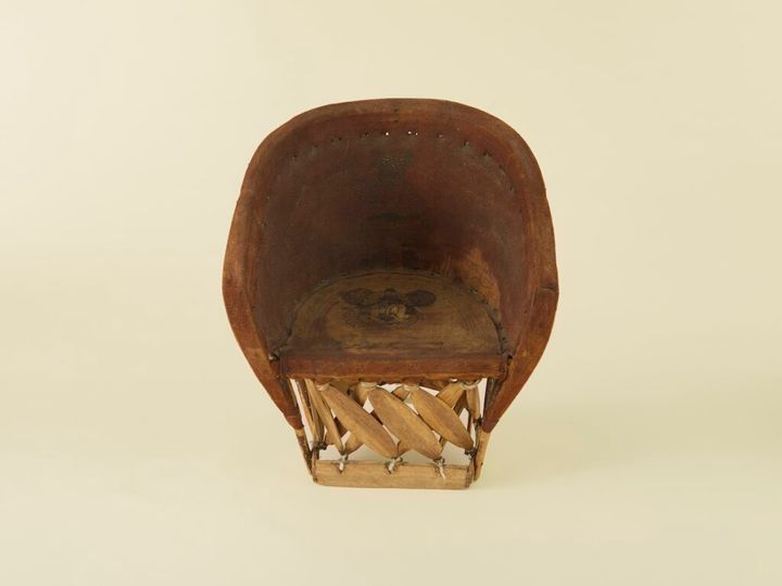 メキシコを代表する工芸品である、エキパルチェアのキッズサイズです。その歴史は長く、はるか昔のアステカ文明の頃から作られていたと言われています。現代も作られ続けていますが、やはり革張りの椅子は、古いものには独特の存在感があるように思います。これはよく見ると、座面にどこかで見たことのあるキャラクターらしきものが描かれていて、なんだか力が抜けてしまうようなユニークな魅力を持っています。
