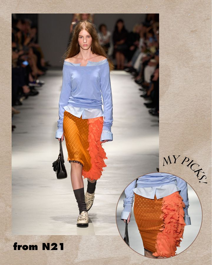 最新コレクションでは、シアーなオレンジのスカートにボリュームのある装飾があしらわれていて、インナースカートのドット柄が透けたディティールもとてもかわいかったです。鮮やかなオレンジ色も、ボトムスでなら挑戦しやすそう。トップスはシンプルにして、スカートを主役にしたスタイリングで着こなしたいです」(坂井さん)