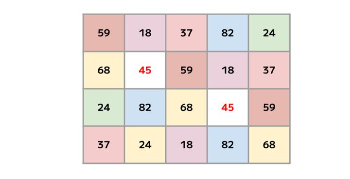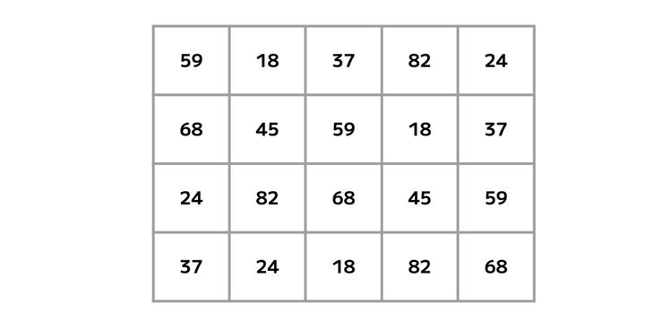 画像の表は横5マス、縦4マス。 そこに「18・24・37・45・59・68・82」という7種の数字が配置されています。