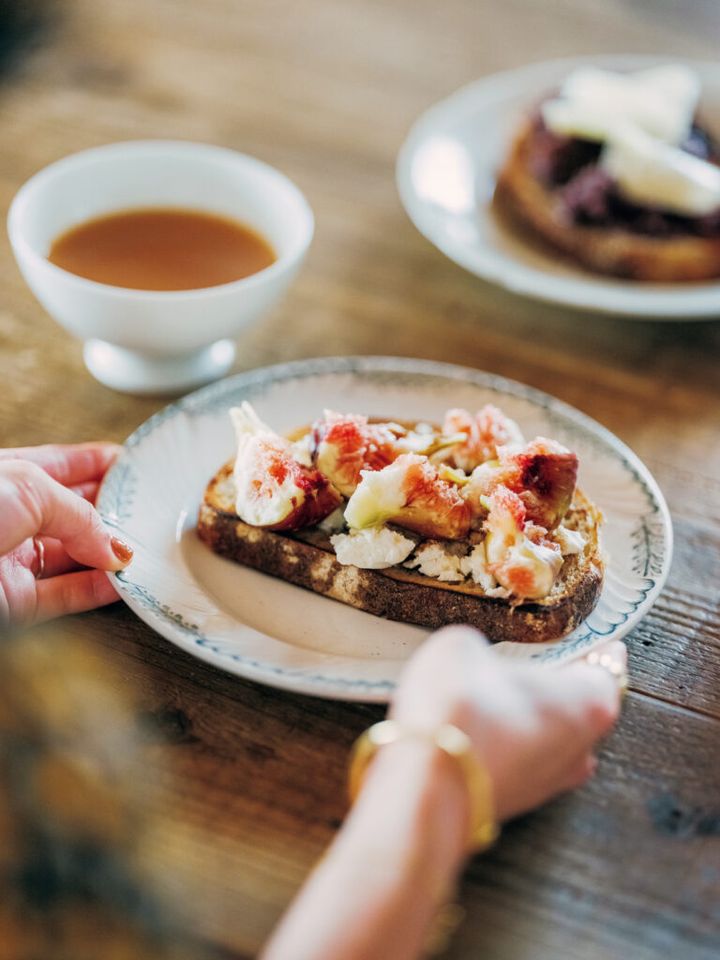 カンパーニュに自家製のリコッタチーズ、イチジクをのせ、バルサミコ酢をかけた。ミルクティーとともに。「〈ストウブ〉のココットで焼くとこんがりいい色」