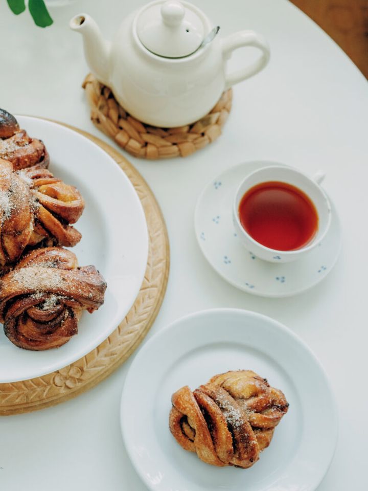 カルダモンロールとアッサムティーで朝食。「もっちりした生地の成形が大変で、形が独特に(笑)」