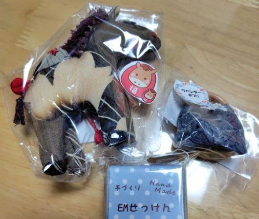 取材の最後は、お買い物タイム! 今回私が購入したのは、一番人気の「ラベンダーポプリの小物」(120円)、干支の「午(うま)」の飾り(1,000円)、以前から興味があった「EM石けん」(100円)です。ポプリは好きな青色をチョイス。干支の飾りは、古布を使った胴体の模様の出方がとても素敵。子どもが午年ということもあり購入しました。