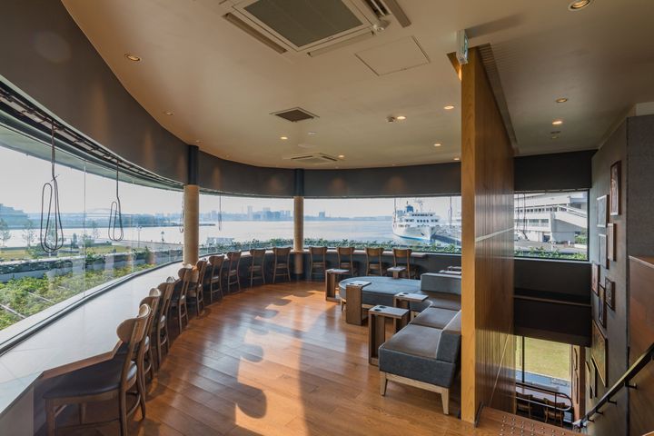 店内は、「KOBE HARBOR COFFEE CRUISE」をコンセプトに、まるでコーヒーを片手に神戸港をクルージングしているかのようなインテリアが広がる。ソファ席やベンチシートが多く配置され、屋外には自然との繋がりを感じられるテラス席も充実している。
