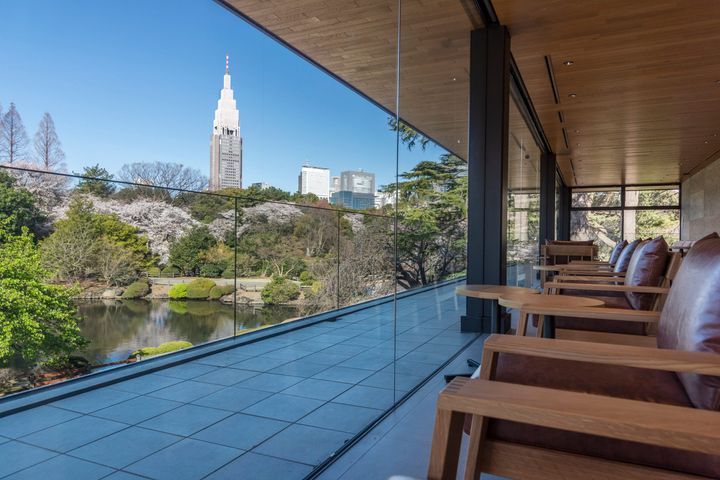 大きなガラス窓には、公園の風景を借景として美しく取り込むため、ガラスの特性やディテールにまで細やかな配慮が施されている。店内からは、「新宿御苑」の緑と、その先に広がる新宿らしい都会的な景色が重なり合う風景を楽しめる。