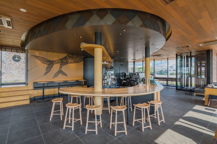 1階にはバーカウンターを配置し、木材を用いたカウンターや天板が、明るく温かみのある空間を演出。2階の客席フロアでは、宮島の伝統工芸である木製しゃもじを用い、「スターバックス」のサイレンの鱗を表現したオリジナルアートが目を引く。