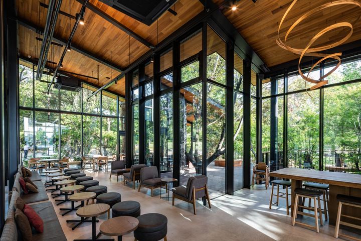 高い天井と大きなガラス面を備えた店内やテラスからは、せせらぎの池や四季折々に移ろう自然の表情を楽しむことができ、ウッドデッキに設けられたベンチでは、まるで森林浴をしているかのような気持ちでコーヒーを味わえる。