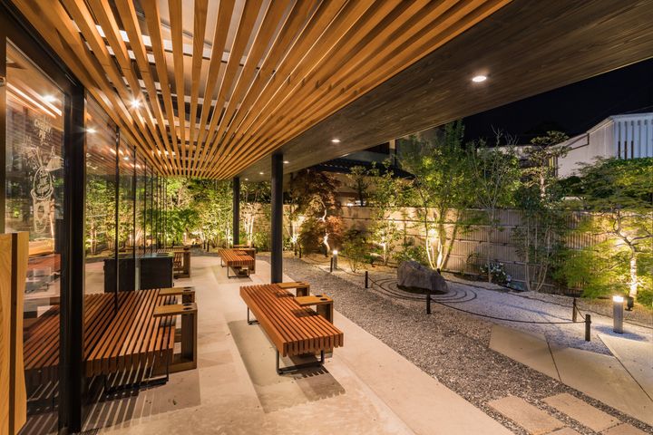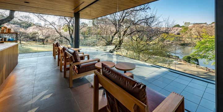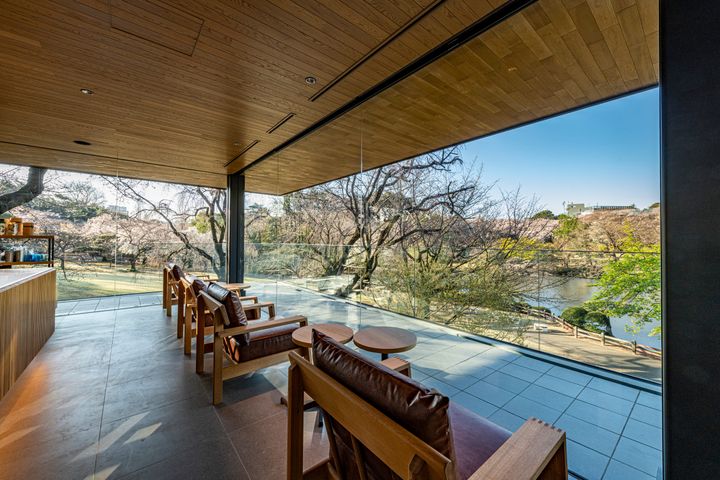屋外ベンチをはじめ、店内のどの席からも美しい借景を堪能できるのも、この店舗の大きな特徴。椅子やテーブルは通常の店舗より低めに設えられ、座ったままでも庭園の景色が自然と視界に入るよう工夫されている。