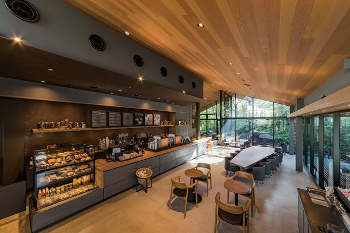 国民公園である「新宿御苑」に、民間企業として初めて出店した「スターバックス コーヒー 新宿御苑店」。四季折々に表情を変える御苑の豊かな自然に溶け込むように建てられており、天井と軒先を連続させた設計により、店内と屋外がゆるやかにつながり、公園の風景をそのまま取り込んだ空間となっている。