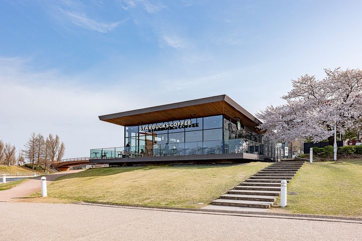 “世界一美しいスターバックス”と称されることも多い、「スターバックス コーヒー 富山環水公園店」。富山の自然と富岩運河の歴史を生かして整備された「富岩運河環水公園」内に位置し、水辺空間の豊かさを存分に感じられるロケーションが魅力だ。