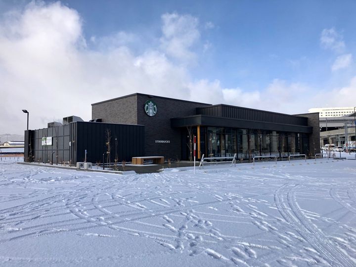 旭川駅南口から徒歩約5分。「あさひかわ北彩都ガーデン」に面した忠別川沿いを進むと、開放的なロケーションに立つ「スターバックス コーヒー 旭川北彩都店」が姿をあらわす。駅近でありながら、周囲には公園と川、そして遠くの山々まで見渡せる、旭川らしい雄大な風景が広がる店舗だ。