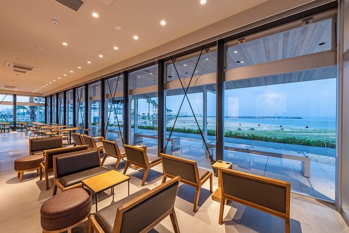 窓際席は海に向かって配置され、景色を主役にした贅沢な時間を演出。テラス席も備えられており、天気の良い日には心地よい海風を感じながら、ゆったりとコーヒーを味わうことができる。