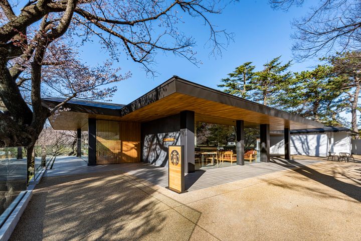 浜松城公園の中に佇む「スターバックス コーヒー 浜松城公園店」は、木々に囲まれた緑豊かなロケーションにあり、公園の自然と一体化するように設計された店舗。建物はできる限り既存の公園の樹木を残し、生かすことを前提にデザインされており、開放感あふれる環境が広がる。
