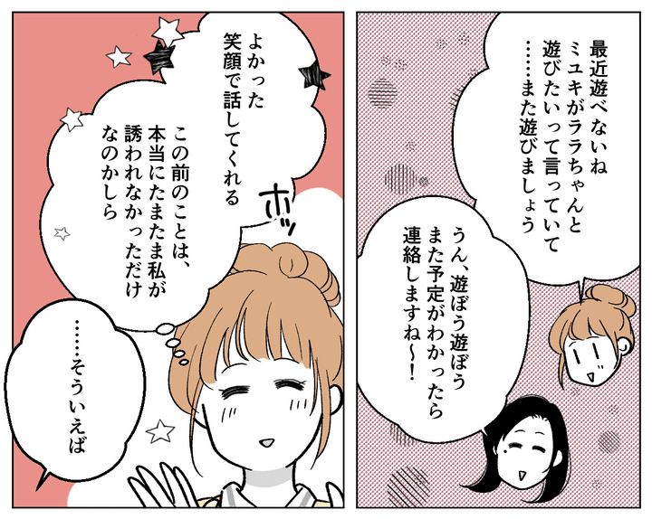 この前は私だけ誘われなかったので「ひょっとして避けられてる……?」と不安でしたが、ユウコさんが笑顔で話してくれて安心しました。もしかしたら本当に、たまたま誘われなかっただけなのかもしれません。そんなことを考えていると、ユウコさんが「そういえば」と話しはじめました。