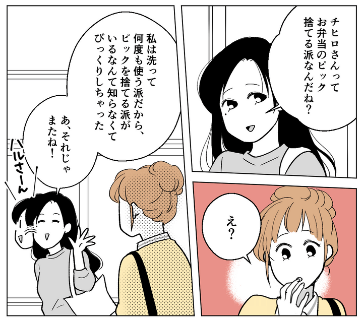 「チヒロさんってお弁当のピック捨てる派なんだね」……思ってもいなかった話題に私はフリーズしてしまいました。ピックを捨てる派、何度も使う派なんて……そんなの誰にも聞かれたこともありません。