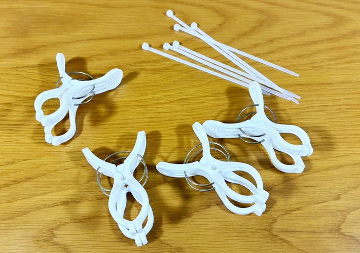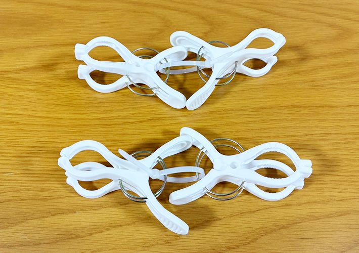 まず始めに、2つの洗濯バサミを結束バンドでつないでください。