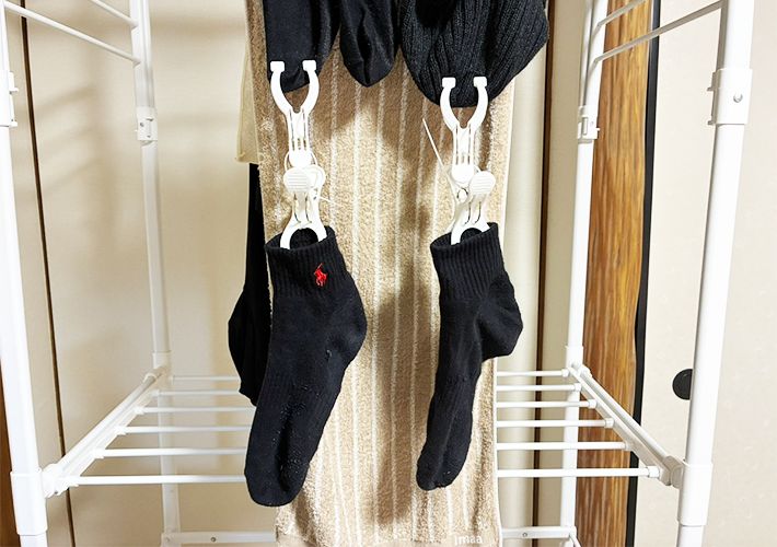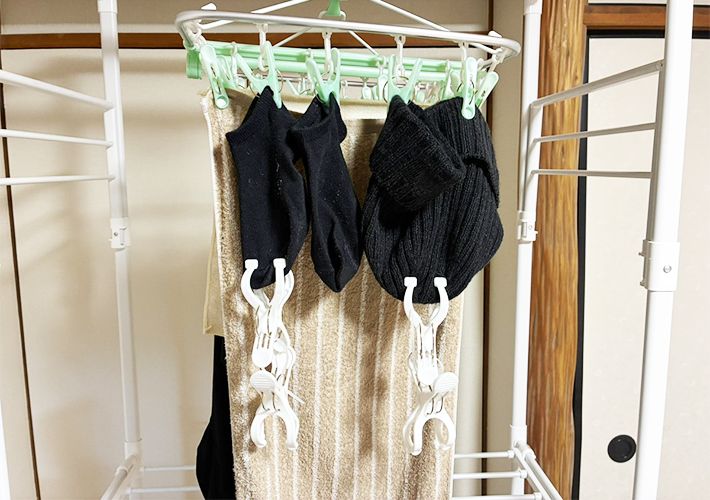 本記事では、靴下を例に説明しましたが、下着類やハンカチなども干すことが可能。ただし、干す量や重さによっては、ピンチハンガーが落下してしまうこともあるため、負荷をかけすぎないように注意しましょう。