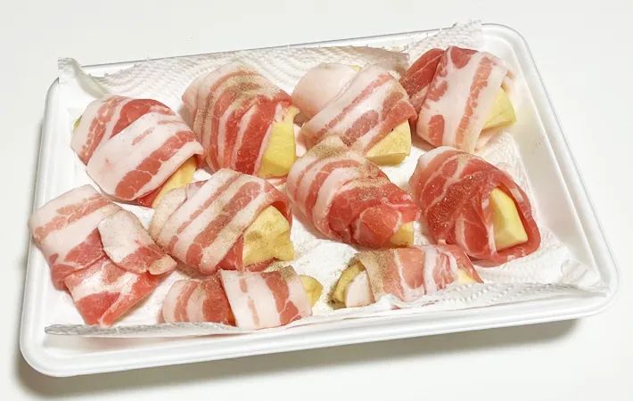 豚バラ肉がしっかりリンゴにくっついて巻きやすく、3分ほどですべて巻き終えました。