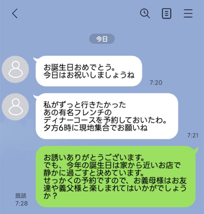 「お誘いありがとうございます。でも、今年の誕生日は家から近いお店で静かに過ごすと決めています。せっかくの予約ですので、お義母様はお友達や義父様と楽しまれてはいかがでしょうか?」