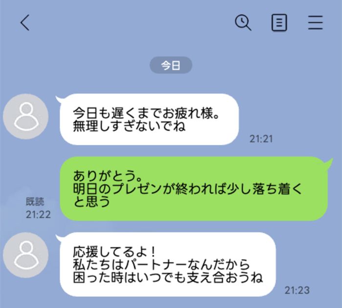 彼女:「今日も遅くまでお疲れ様。無理しすぎないでね」