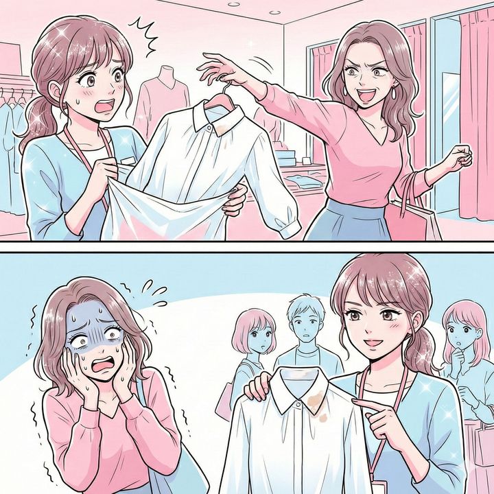 「元々汚れてた!」メイク汚れが付いたまま、試着した服を戻す女。だが、店員が事実を伝えると…【短編小説】