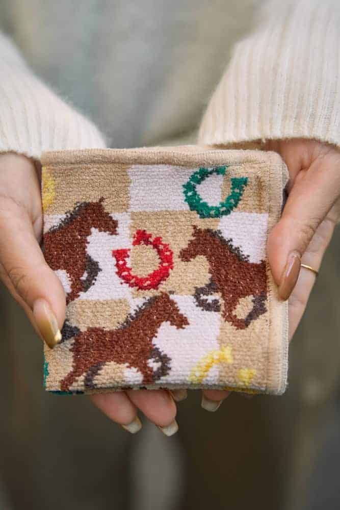 チェッカーフラッグを思わせる格子柄に、軽やかに駆ける馬たちを描いた遊び心たっぷりのハンカチ。カラフルな蹄鉄がリズムよく散りばめられ、見ているだけで楽しさを感じさせます。吸水性に優れたシュニール織ならではの心地よさで、使うたび気分も明るくなれる一枚。