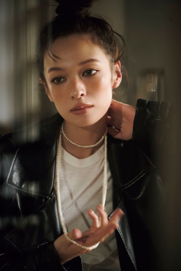 レザージャケット¥52,800(ジャッキー/ジャック・オブ・オール・トレーズ プレスルーム)、パールネックレス¥35,200(Pearl for Life/ロードス)、Tシャツはスタイリスト私物