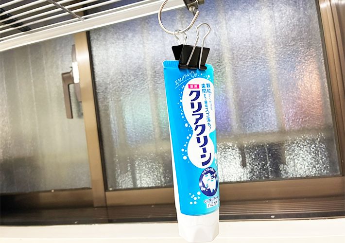 次に紹介するのは、ダブルクリップを使い、歯磨き粉や塗り薬などのチューブ類を吊るして収納する方法です。