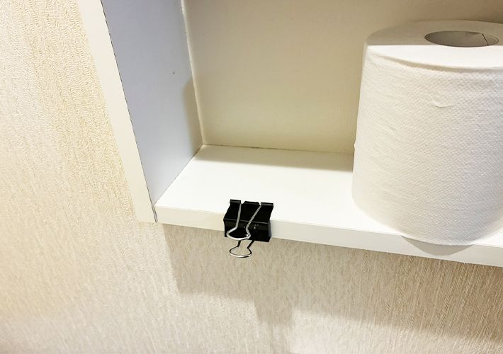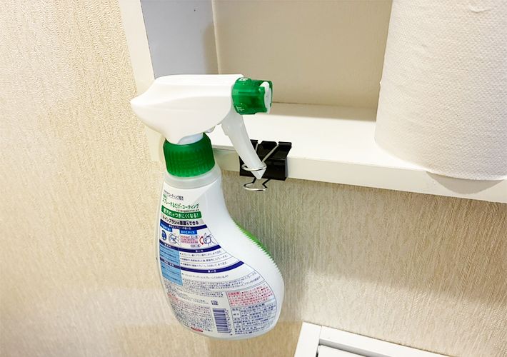 最初に紹介するのは、ダブルクリップを使って、洗剤や消臭剤などのスプレーボトルを収納する方法です。
