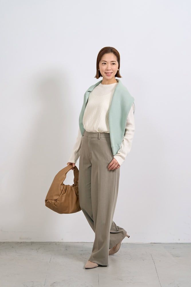 暗めの色を選びがちな冬は、レフ版効果が期待できる薄手の白セーターで顔色を良く見せます。腰からのラインがとてもキレイなハイウエストのストライプパンツと合わせれば、オフィスシーンにも使えそう。柔らかいライトグレーなのでかっちりし過ぎず、優しげに。肩から羽織った顔映えする淡いグリーンのセーターは、冬の重たい印象を一新。