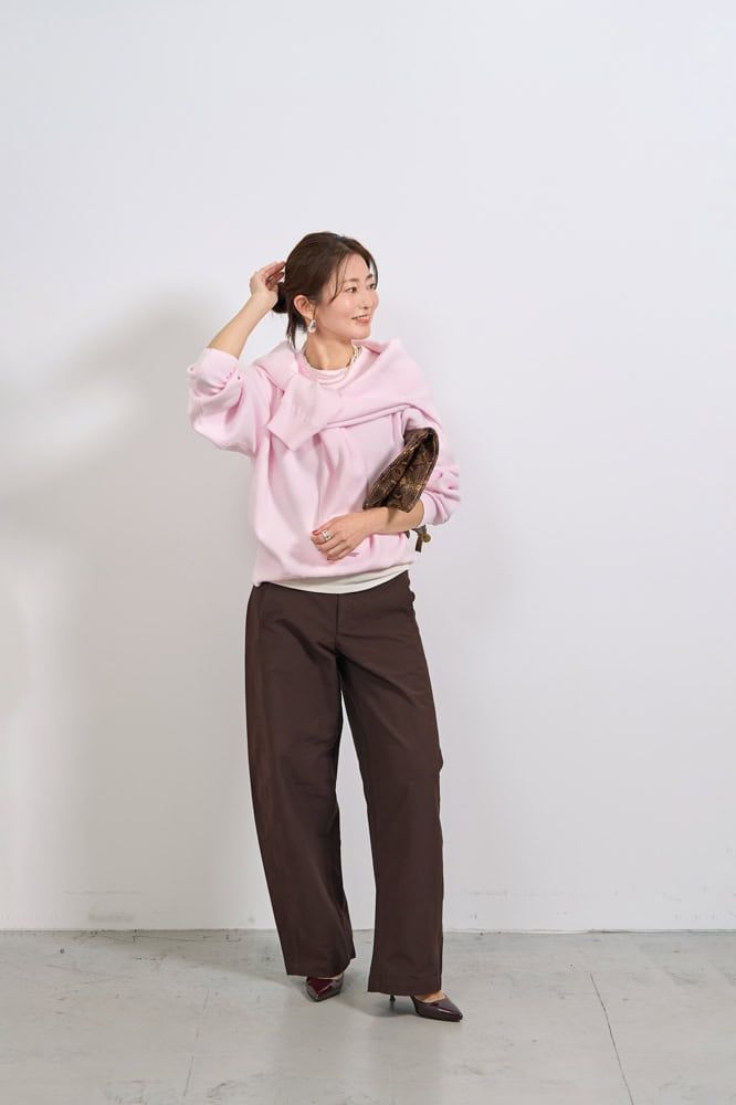 ユニクロ : シーのベストセラーであるこちらのニットは、柔らかく着心地も抜群。ニットでありながらスウェットのようなデザインとシルエットなので、きれい見えしつつ抜け感のあるカジュアルスタイルに仕上がります。ダークカラーになりがちな冬も、新色のピンク投入で一気に華やかに。ユニクロ価格だから叶う2枚使いでレイヤードしつつ、今年らしいブラウンのバレルレッグパンツを合わせたら、春まで楽しめること間違いなし!