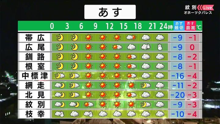 広く晴れますが、朝は北見で-20度と冷え込むでしょう。太平洋側に乾燥注意報が出ています。火の取り扱いに注意して下さい。枝幸は朝まで雪が降るでしょう。