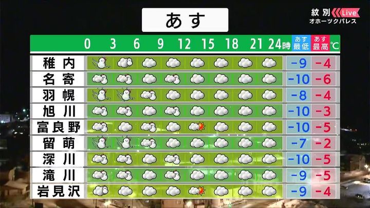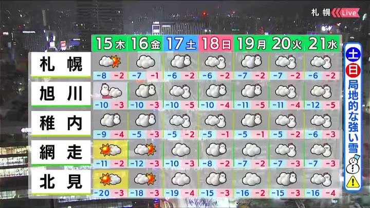 旭川は、この時間は雪は降っていないようですが、今夜も強い雪や風で見通しが悪くなることがありそうです。旭川市内の小中学校でもあす15日(木)、始業式です。あす15日(木)は雪や風は弱まりますが、厳しい寒さが続きます。