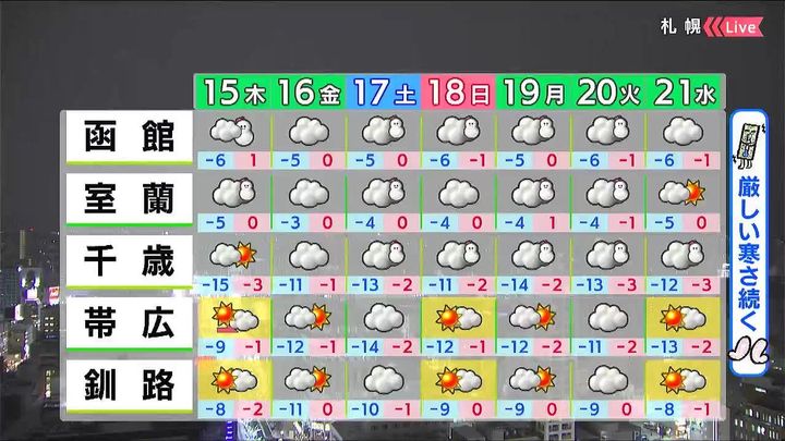 きょう14日(水)は寒さが厳しく、札幌の午後5時までの最高気温は-6.4度でした。このままいくとこの冬一番の寒さになりそうです。