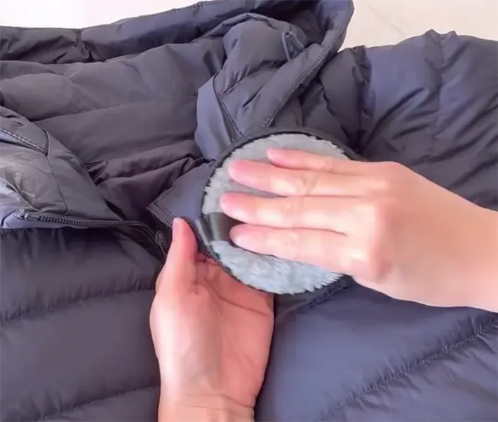 軽く絞ったら、ダウンジャケットの汚れた部分を、優しく縦横に数回なでましょう。