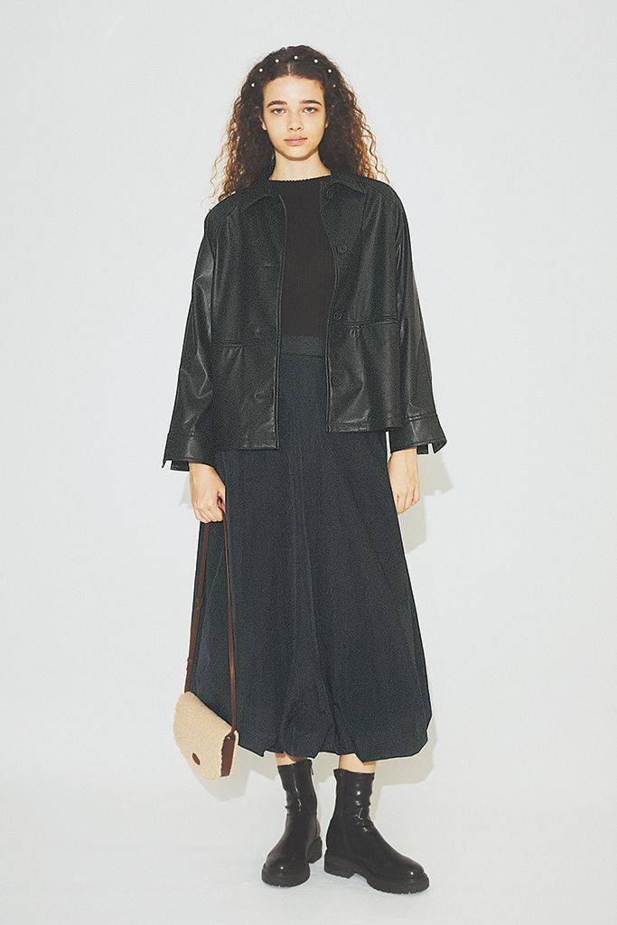 レザーのハードさを和ませる、スカートのラフなシルエット。ニットやウールよりも近しい素材どうしだから、抑揚をつけながらもちぐはぐしない見た目が成立。