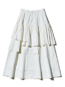 軽さが欲しい厚着の季節に好都合な白は、変則的なティアードデザインがモードな面持ち。腰まわりはフラットで、厚手トップスとも好バランス。ナチュラルな風合いの綿混。適度な重みで広がりすぎない。
