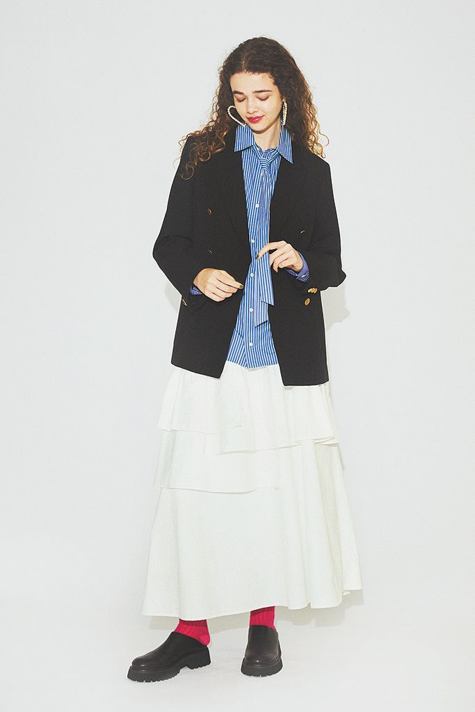 ティアードで抑揚をつけて、お堅く見えないジャケットスタイルへ