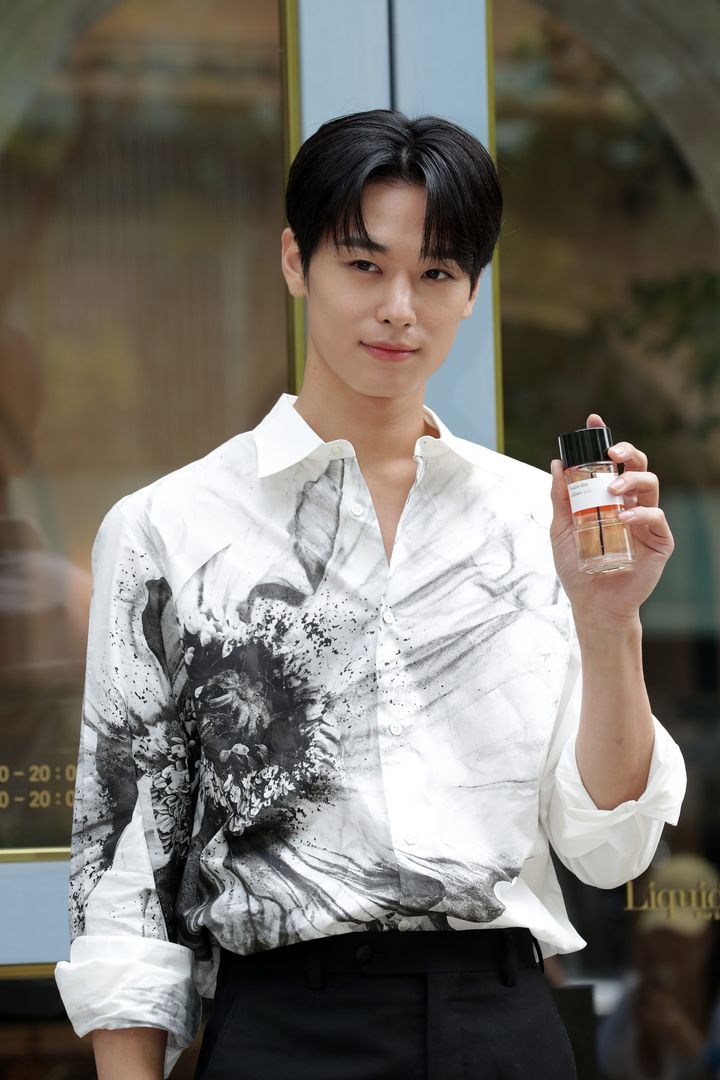 「ダミアーニ」のイベントにて。膨張して見えやすい白ニットがここまで似合ってしまうのは、肩幅と胸板がしっかりあるジュヨンだからこそ。ややウェットにセットした繊細な前髪と、発光するようなシルキーなツヤ肌で、色っぽさと清潔感をWで叶えて。