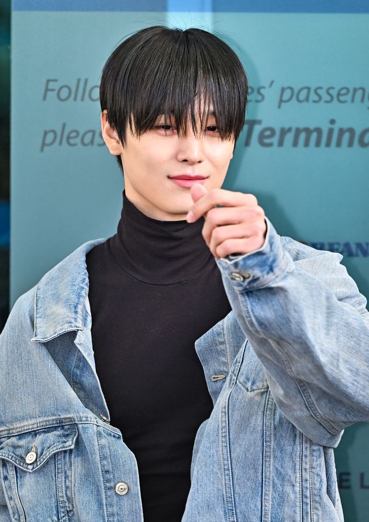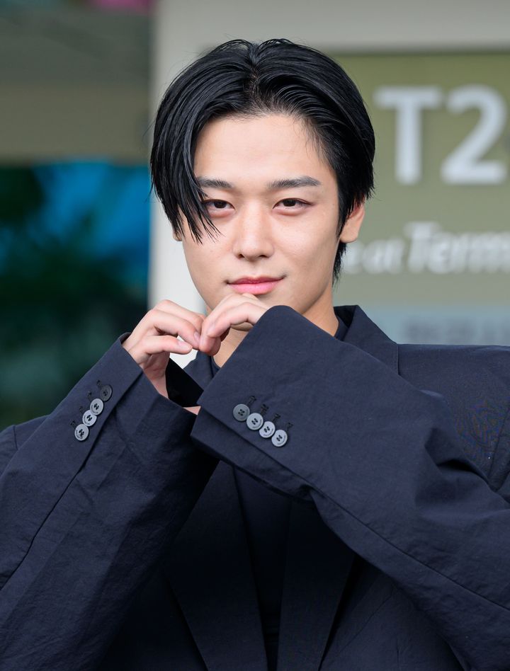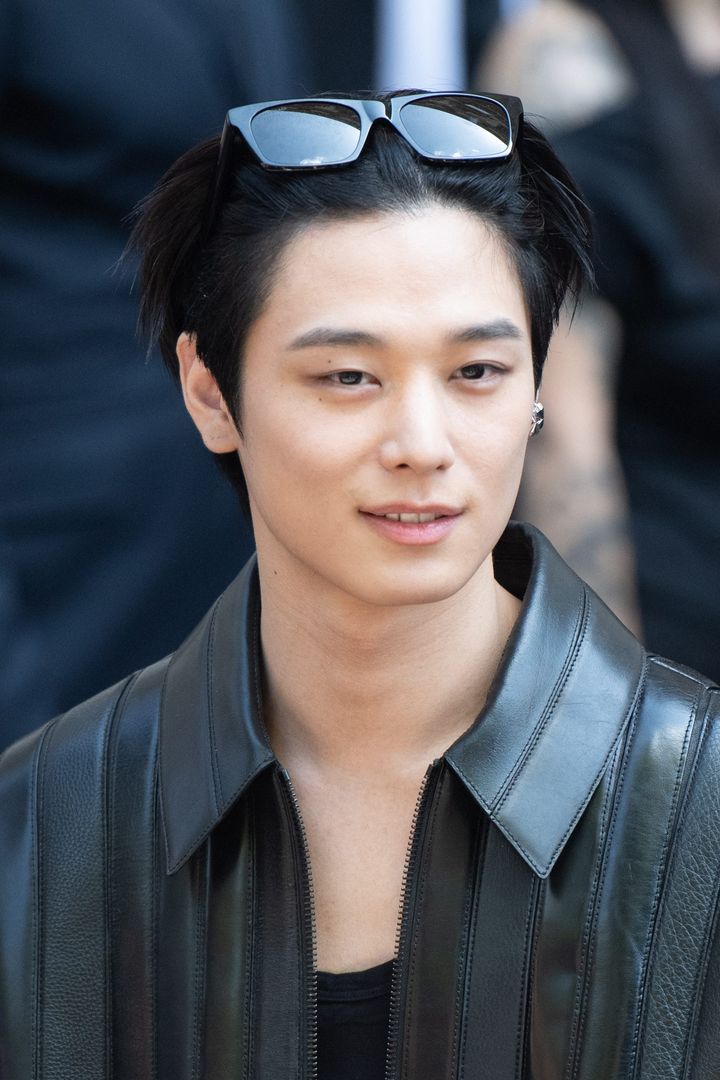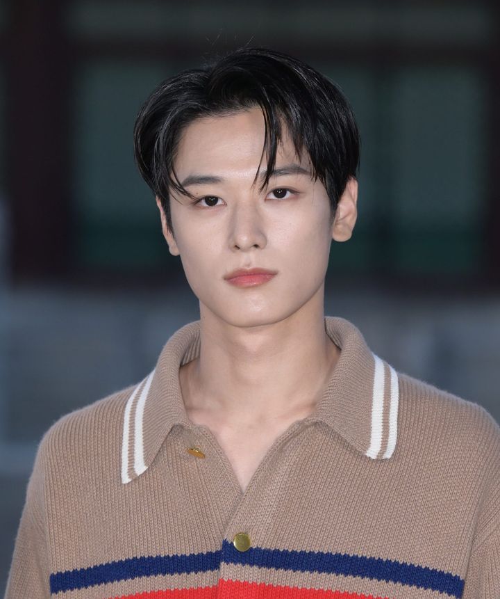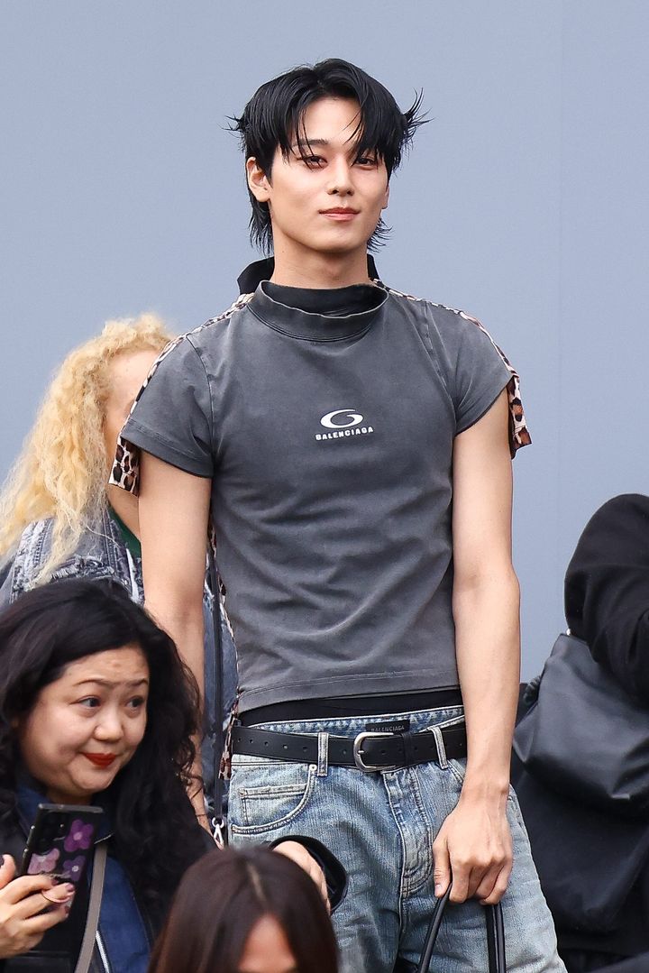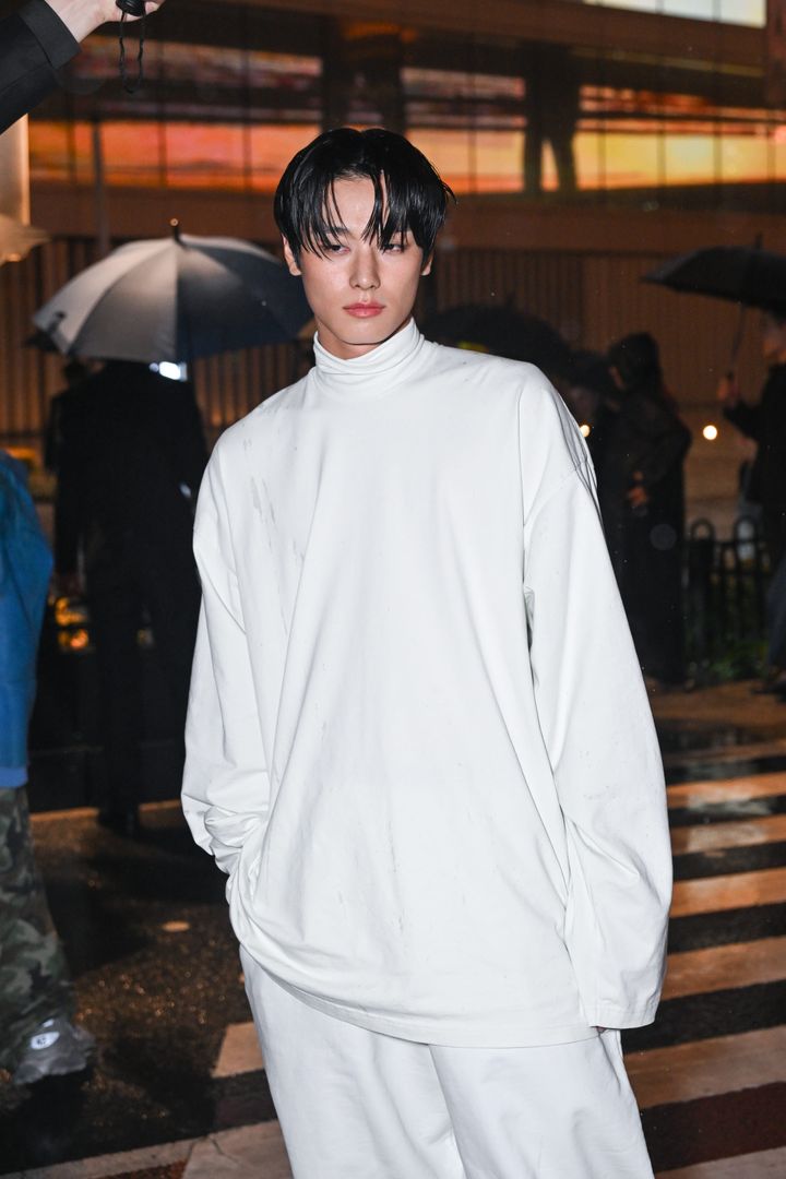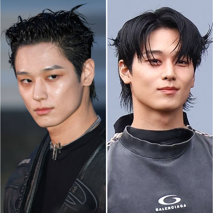 2024年に「バレンシアガ」“ル シティ”のキャンペーンモデルに抜擢されたジュヨン。ショーに向かう空港ショットでは、長く伸びた前髪をストレートに下ろし、丸みのある黒髪マッシュで好青年ヘアに。