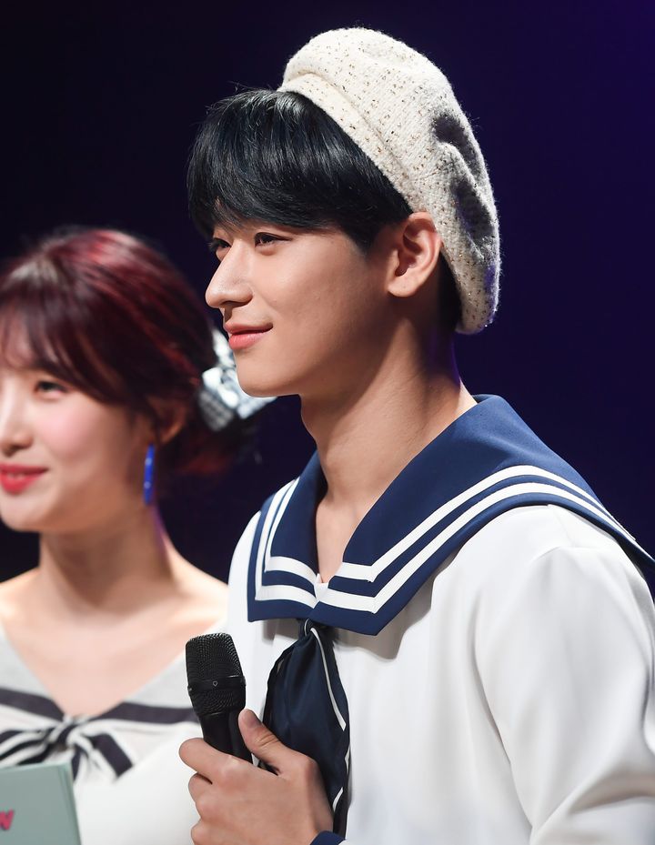 音楽番組「THE SHOW」のMCを務めていたジュヨン。この日のイベントでは、セーラー×ベレー帽のマリンルックで登場。ちょこんと被ったキュートなベレー姿に目がいきがちだけど、イケメンフェイスは隠せない!