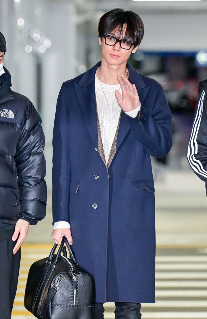 ファンをときめかせたノーセット×黒縁メガネのお宝空港ショット。さらりと風になびく前髪が爽やかな大人の魅力たっぷり。