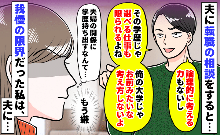 3. 転職の相談をすると「お前の学歴じゃ仕事選べないよなぁ!」私立大卒だと見下す夫にモヤッ…反論したら