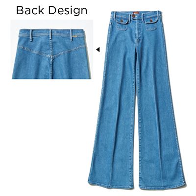 フレアデニムパンツ/マザー(LITTLE LEAGUE INC.) ひざ下を長く見せるフレアシルエットに加え、注目すべきはバックスタイル。計算されたVステッチが視覚効果で小尻を演出。360度どこから見ても美しい、デニム選びの最終結論。