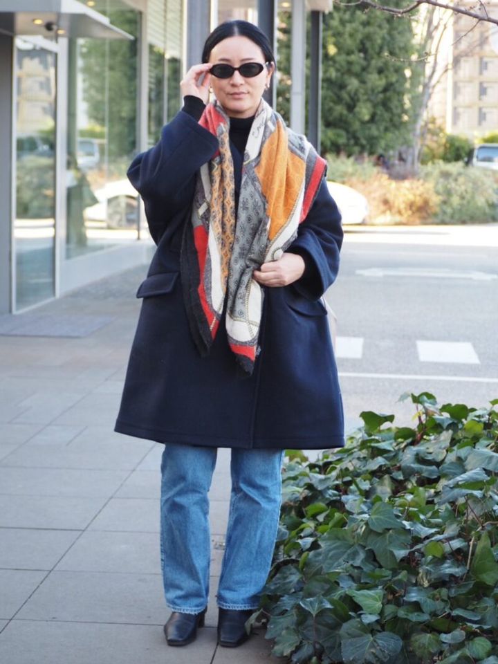 ブルーデニムと黒のハイネックに合わせたのは、「フレームワーク」のコート。ラインが美しく、カジュアルなアイテムと合わせてもきれいめに仕上げてくれる名品です。「デニムが好きで、おそらく10本くらい持っています。ステッチと小物の色を合わせたりするのも楽しいです」