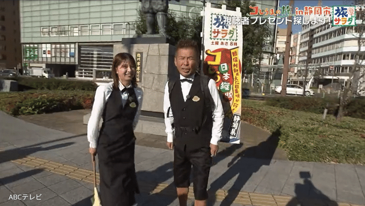 そんな大仁田アナは、2026年最初の『朝だ!生です旅サラダ』日本縦断コレうまの旅コーナーで、同番組にレギュラー出演するタレント・勝俣州和と静岡県静岡市へ! “特別な助っ人”ということで勝俣は、大仁田アナと同じく白のシャツに黒のベストと蝶ネクタイを身に着け、スラックスは短めのお馴染みスタイルだ。