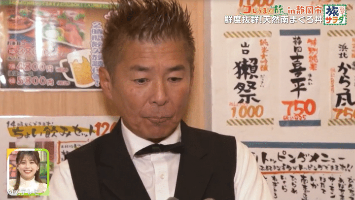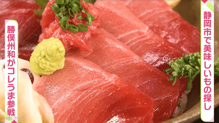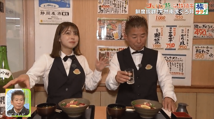 勝俣が張り切って地元民に聞き込み、取材交渉してたどり着いたのは、鮮度抜群のまぐろ丼が味わえる「まぐろ丼 ぶんた」だ。2026年最初の放送ということで、大仁田アナがまず注文したのは、名物のまぐろ……ではなく、静岡の地酒・開運!