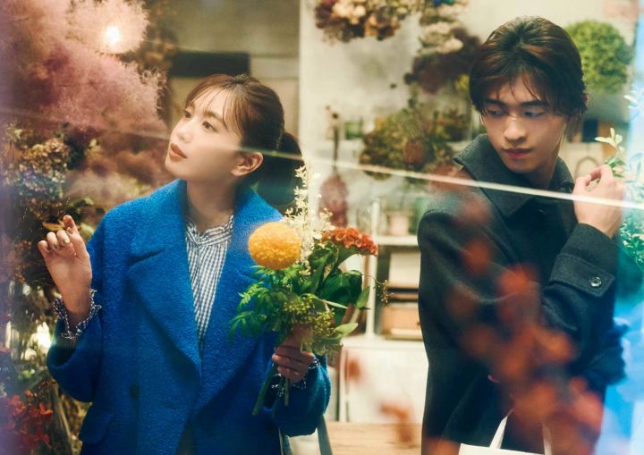 季節の花は風水的に運気がアップするラッキーアイテム。お花に負けないブルーのコートとシャツでキレイめにしてみた。形がプレーンだから、通勤でも浮きません。