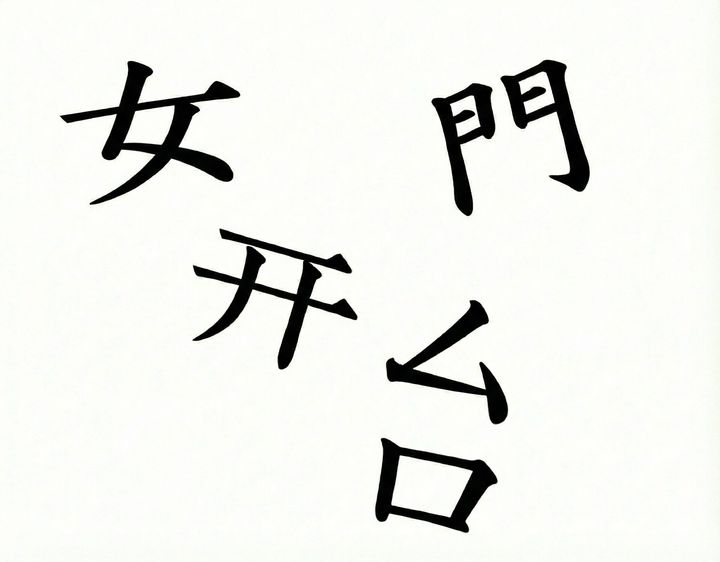 構成: 一文字目は「門」の中にパーツが入る形、二文字目は「女」がへん(左側)に来る形です。